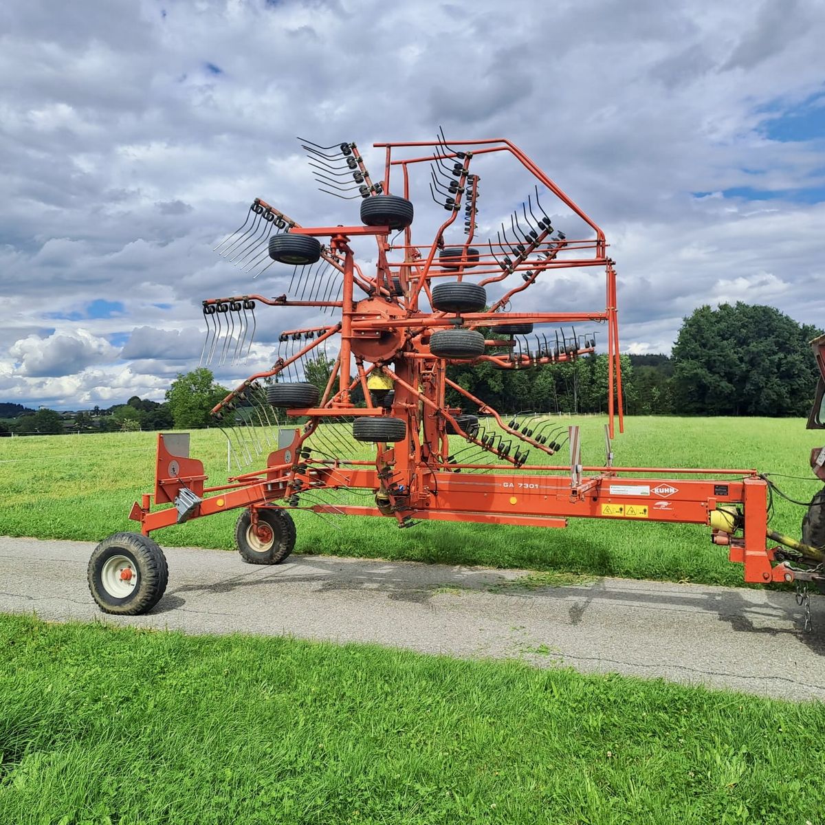 Der Kuhn GA 7301 ist ein bewährter Schwader für den professionellen Grünlandeinsatz. Mit seinen zahlreichen Ausstattungsmerkmalen wie Tandemachse, Nachlaufeinrichtung und Zinkenverlustsicherung sorgt der Schwader für saubere Schwadarbeit und maximale Flächenleistung.